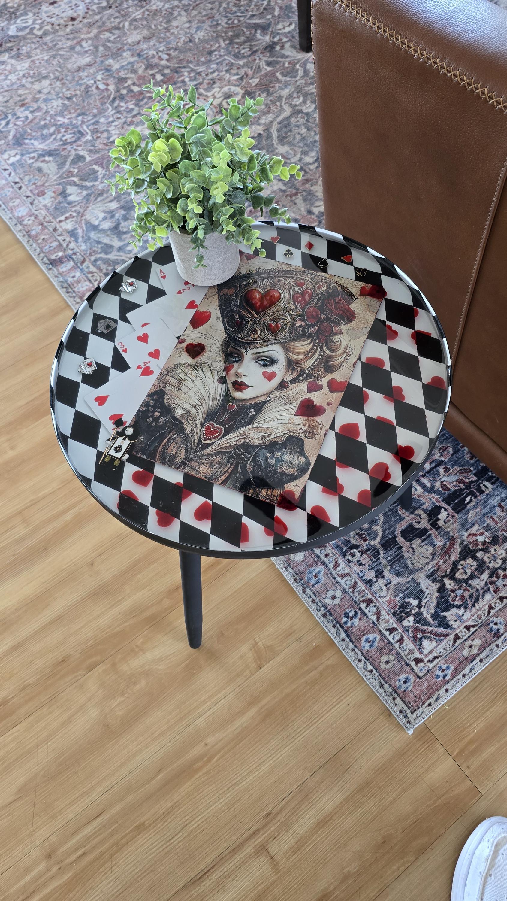 Round Queen of Hearts inspired end table with black and white checker background, preserved in crystal clear resin.