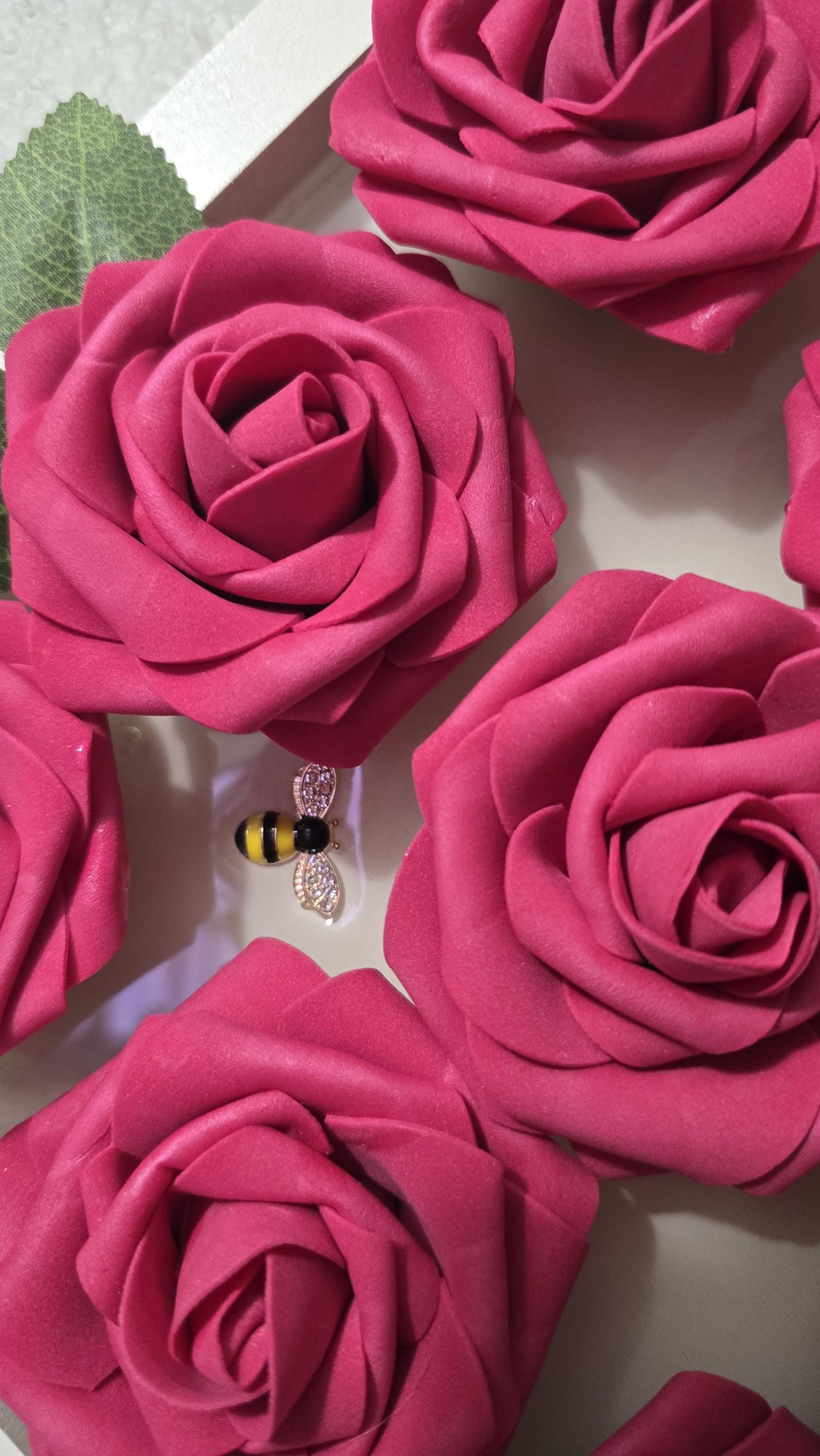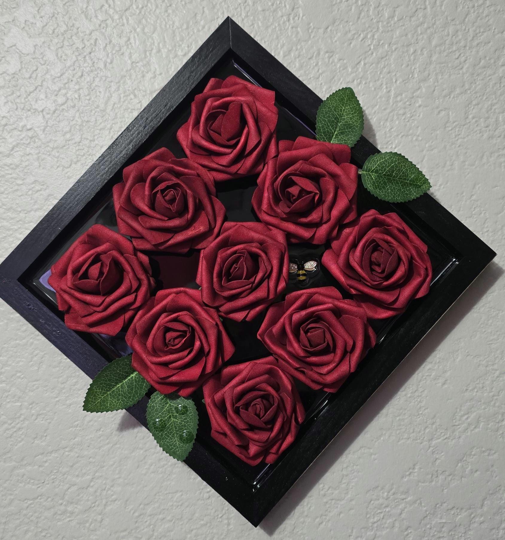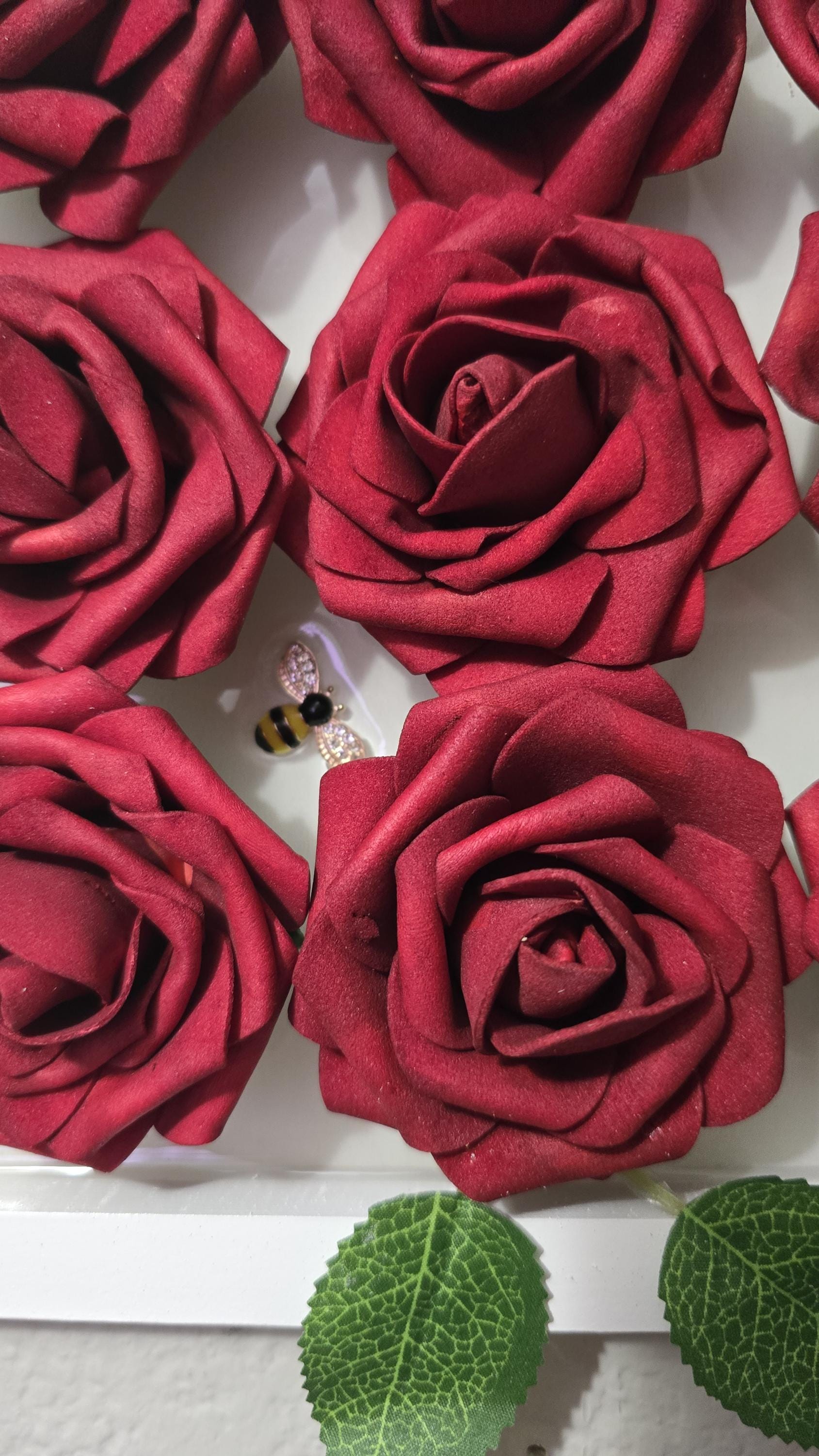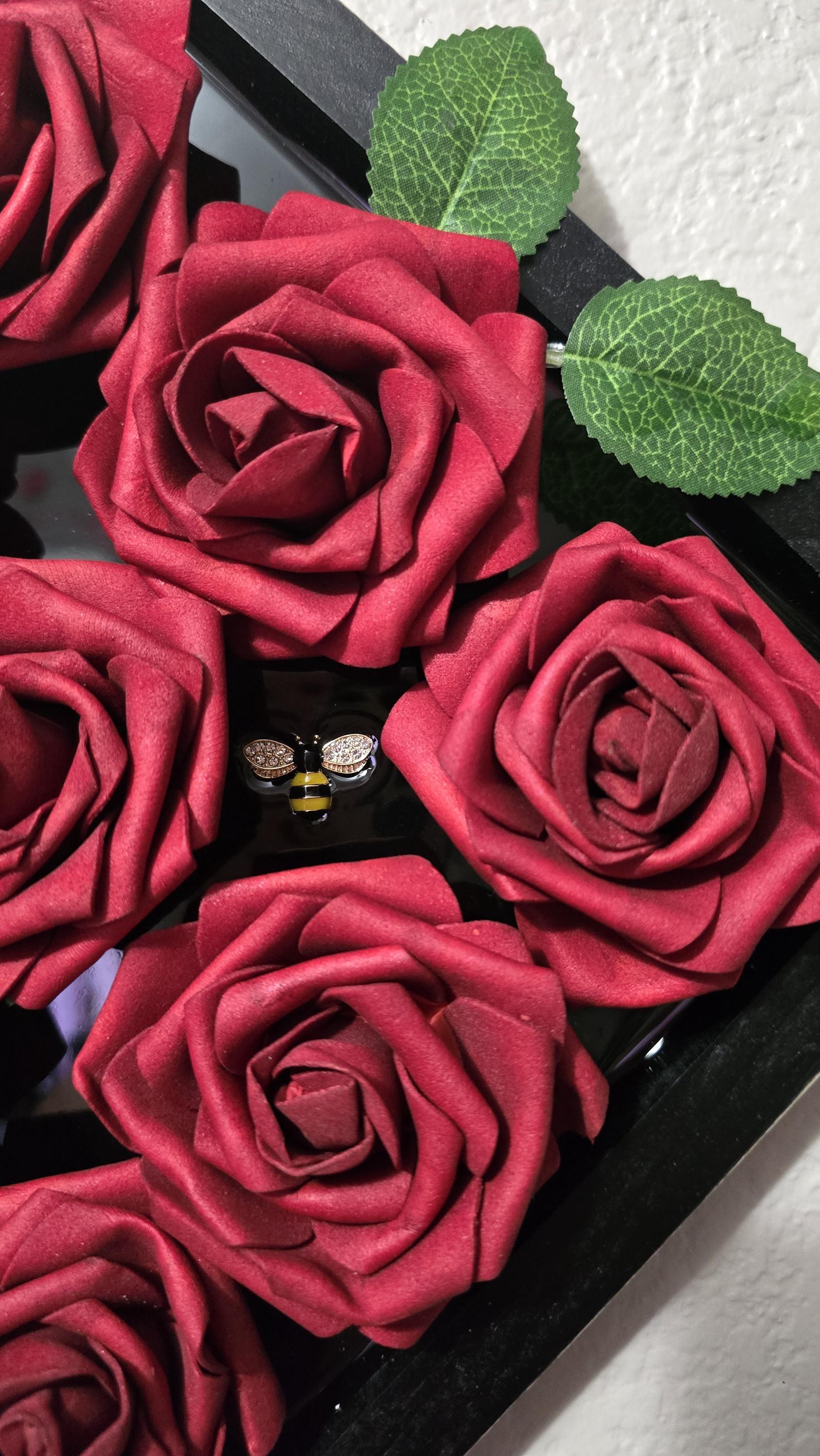 Whimsical, one of a kind, unique wall art: My version of a shadow box. This beauty has high quality foam roses, secured to a wooden box with a small bit of high shine glittery resin. And don't forget the super cute shiny bee!! It can be hung on a wall or displayed on a shelf. These are truly one of a kind, I never duplicate any of my designs. This is the perfect gift for the hard to shop for flower lover in your life, that already has everything. Plus, these flowers last more than a couple of days.
