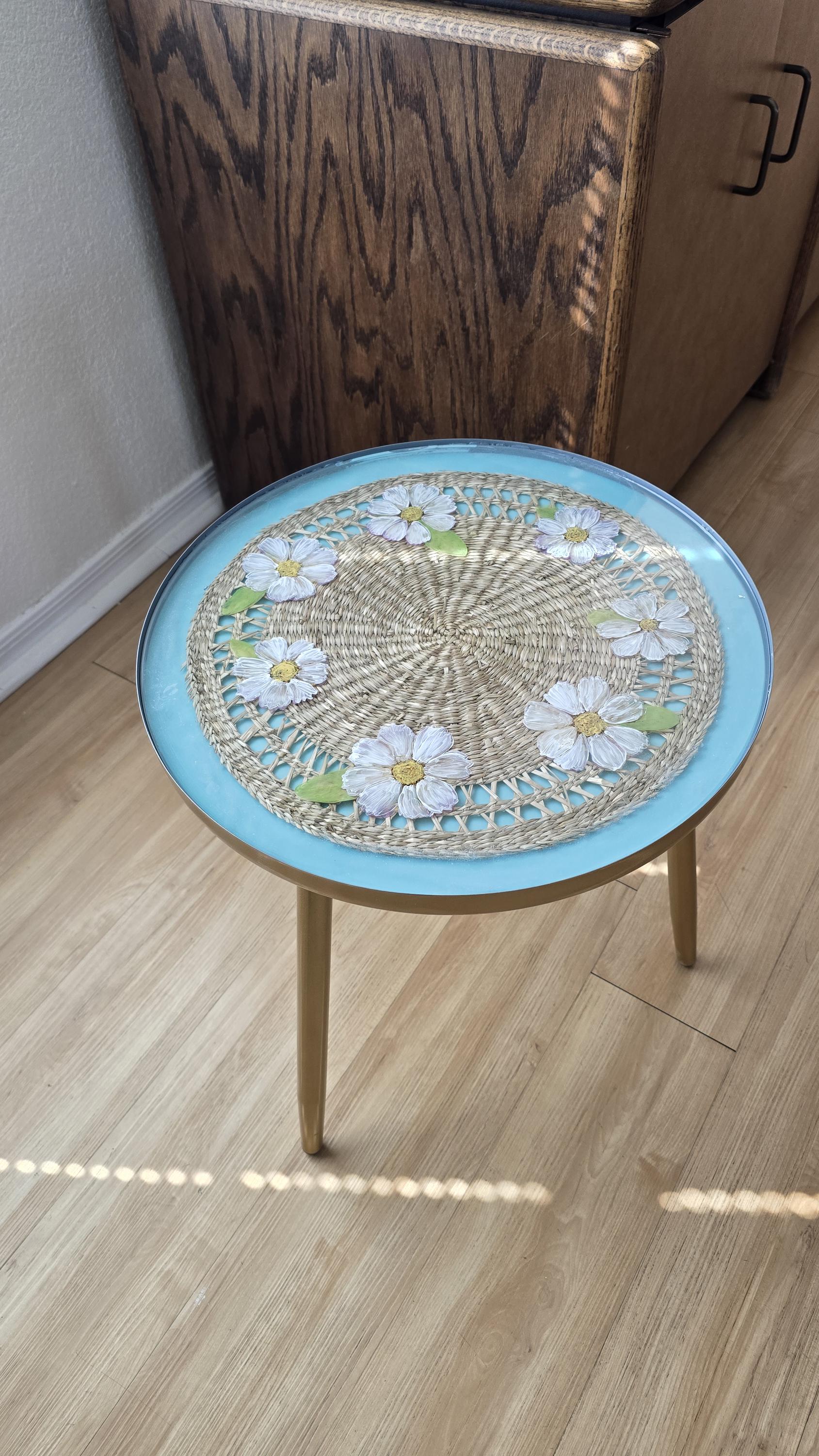 ✓ This beautiful handcrafted round end table is made from handpainted flowers and wicker forever preserved in  layers of slow poured high-quality epoxy resin.. This table will become an integral part of your interior or exterior (out of direct sunlight), bringing a piece of natural beauty into your life. It is an exceptional work of art that inspires with its sophistication and elegance.
